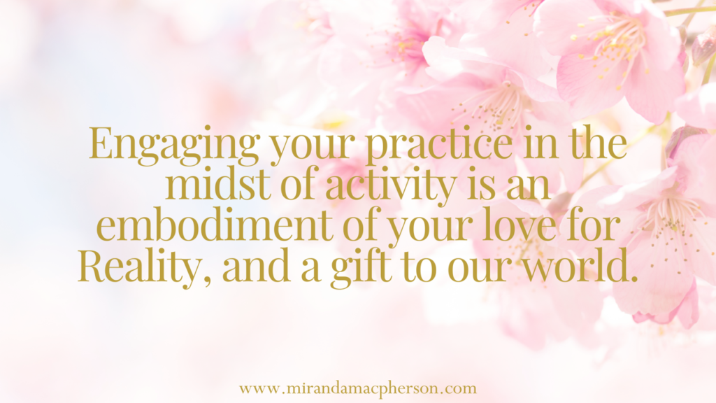 These days, my focus is mostly on embodying the fruits of practice in every moment. So, when I notice my consciousness contracting for any reason – too many emails, daily stressors, or even the heart-break of watching the news and seeing yet another painful explosion of ignorance, I have found “on the spot” versions of my meditation practice. This has been a game changer, a beautiful way to live into the gifts of practice amidst ordinary everyday life in this crazy world.