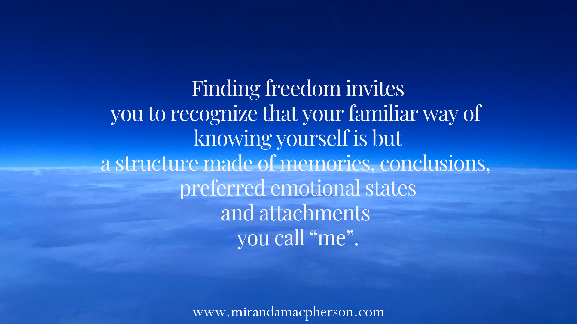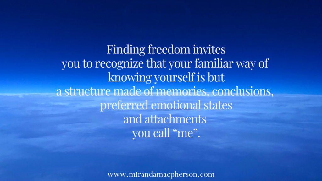 It was miraculous to open to the truth of “I’m nothing” and let all of my ego compensations go, to just be here, not trying to be special, different, or better. By Grace, I dropped through my own self-image, and with the disappearance of “me” and “story” came the disappearance of a fearful world. I now understand why this had such power to shift my center of gravity so substantially. It can for us all.